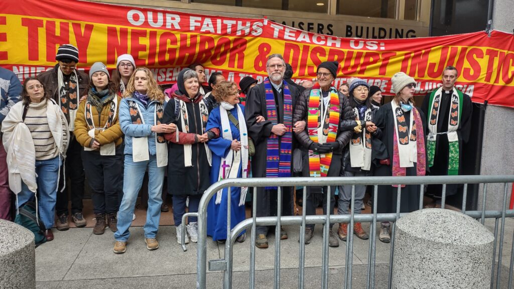One of the visions we have as a church is to be a community that nonviolently disrupts injustice. On December 16th two pastors and several elders and members of our church helped us live out the vision by joining an effort to shut down the ICE headquarters and detention center at 630 Sansome Street in San Francisco. Three of them, Rev. Tom Harris, Rev. Diana Gibson, and Ruling Elder Leif Erickson, joined an organized blockade of the entrances to the building in an effort to close it for the day. In doing so they were arrested, charged, and released. This faith-based nonviolent direct action was organized by the Interfaith Movement for Human Integrity, a long-time community partner of our church.